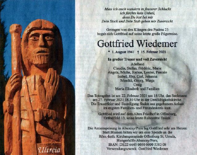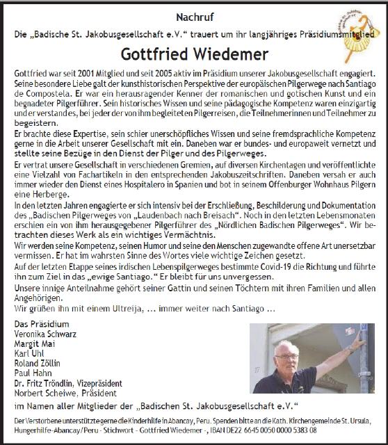 Am Montag, den 15.Februar 2021 starb nach kurzer und schwerer Erkrankung unser langjähriges Präsidiumsmitglied Gottfried Wiedemer begleitet durch seine Familie in Offenburg.